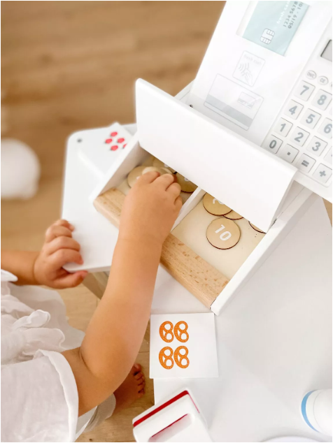 Une caisse enregistreuse en bois moderne et réaliste qui rend les jeux d’épicerie encore plus amusants et éducatifs. Cette caisse est équipée de nombreux accessoires et fonctionnalités pour une expérience de jeu complète :